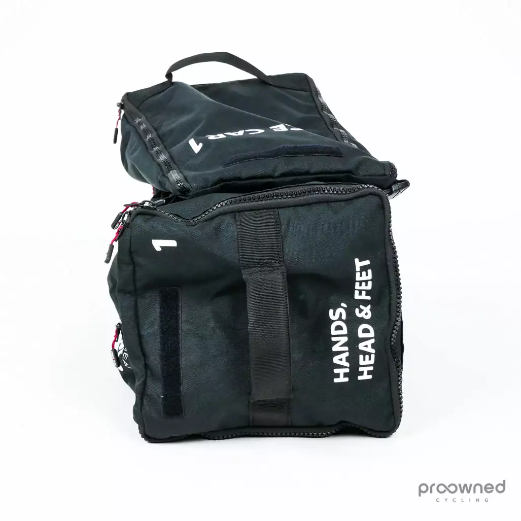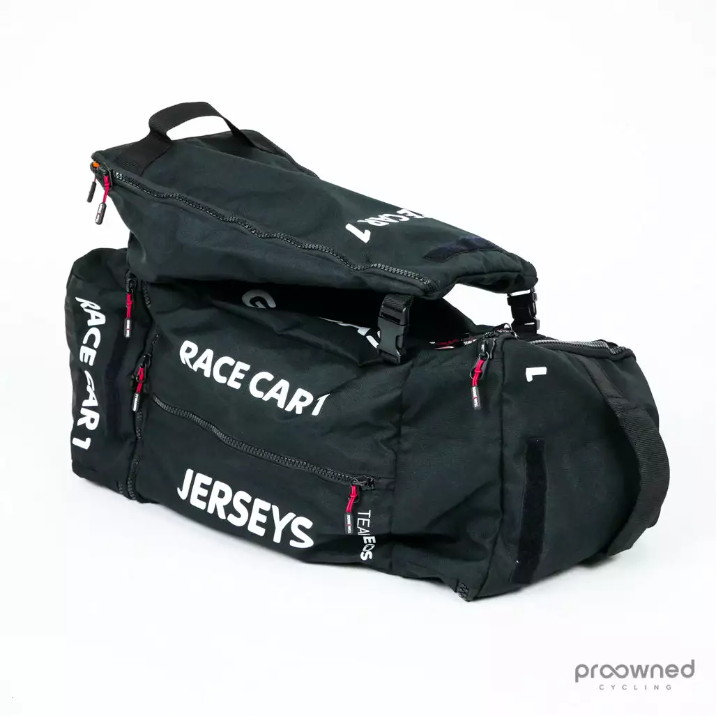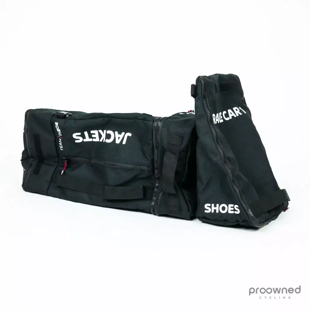 The race rain bags are used by the team for races and are stored in the team car behind the peloton. The race bag is used for essentials for each rider to use during a race.