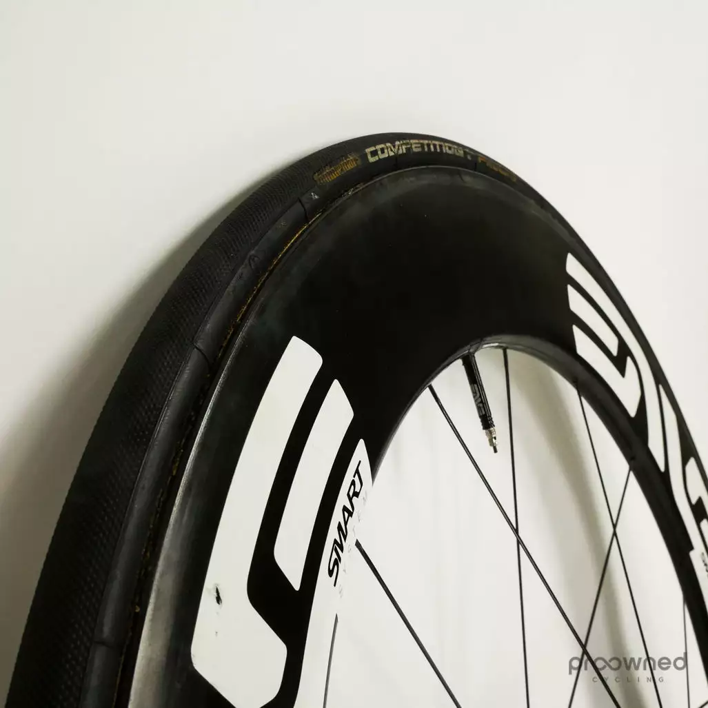 The wheel is equipped with a Continental Competition AL LTD 22c tubular tire which is used but still in good condition.