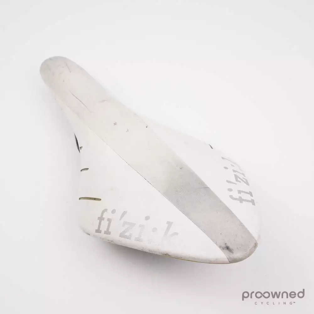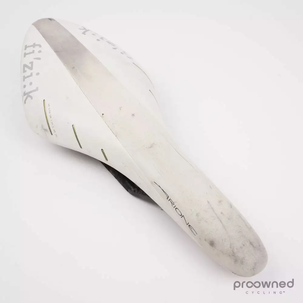 The saddle has been used for several kilometres and it shows through the contamination of the white surface colour. Furthermore, there are small and minor marks on the saddle. Overall, these “flaws” are purely cosmetic. The saddle is in perfect working condition.