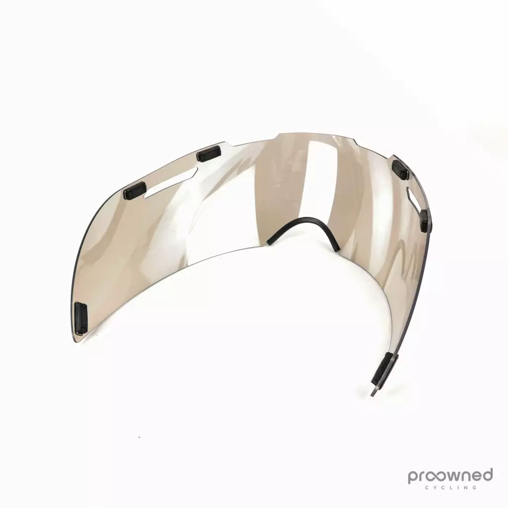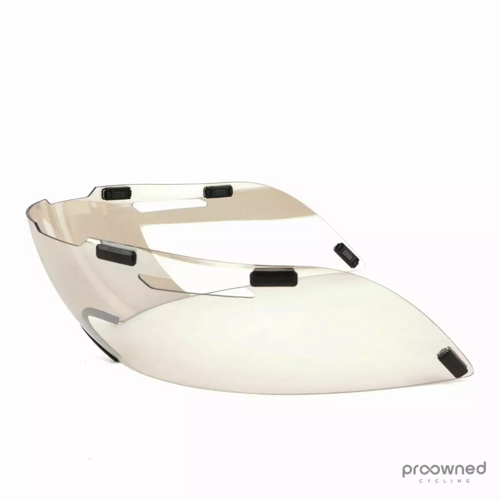 Original Lens for the Giro Aerohead time trial helmet. The visor is made for low light conditions. It is clear with a silver tint. The lens is made using Carl Zeiss technology to ensure exceptional optical precision and clarity. The lens is fixed to the helmet using magnets.