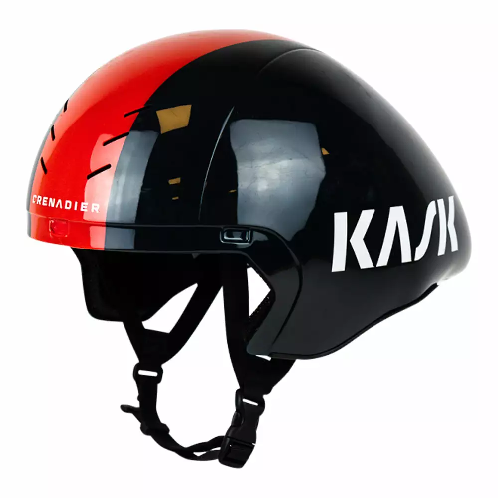 The Kask Bambino Pro Evo Time Trial Helmet by Ineos Grenadiers is a further development of the popular short tail helmet Kask Bambino. Further tested in the wind tunnel and by Team Ineos Grenadiers riders.