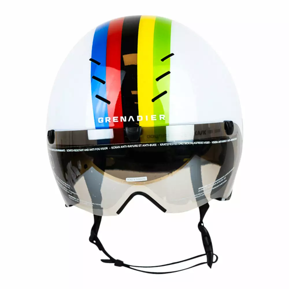Kask Beluga F. Ganna World Champion Time Trial helmet by Ineos Grenadiers is as aerodynamic as possible due to the reduction in air resistance that occurs when riding. The helmet provides ample protection during the fall since no rider can safely stay in the same position for the entire race.