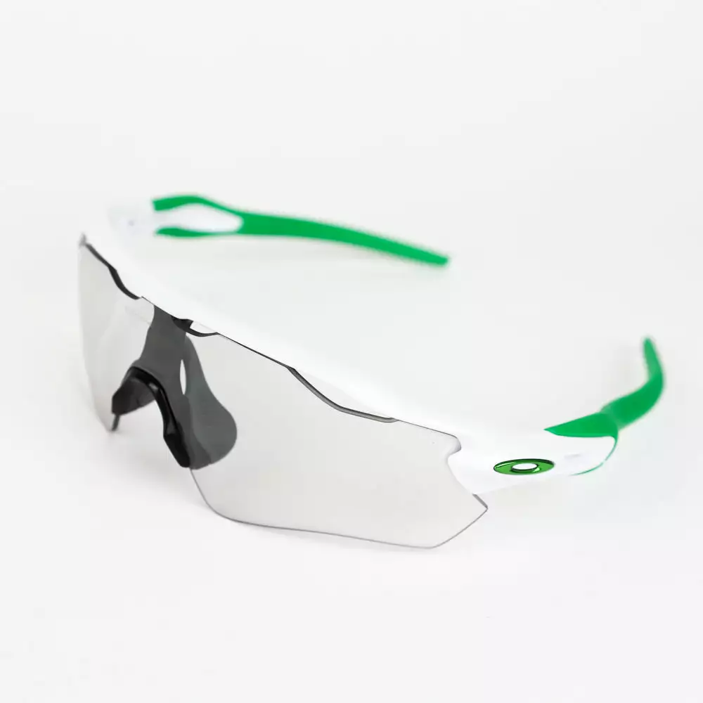 Brand new Oakley Radar EV Polished White/Bright Green with a Black Iridium Photochromic lens.