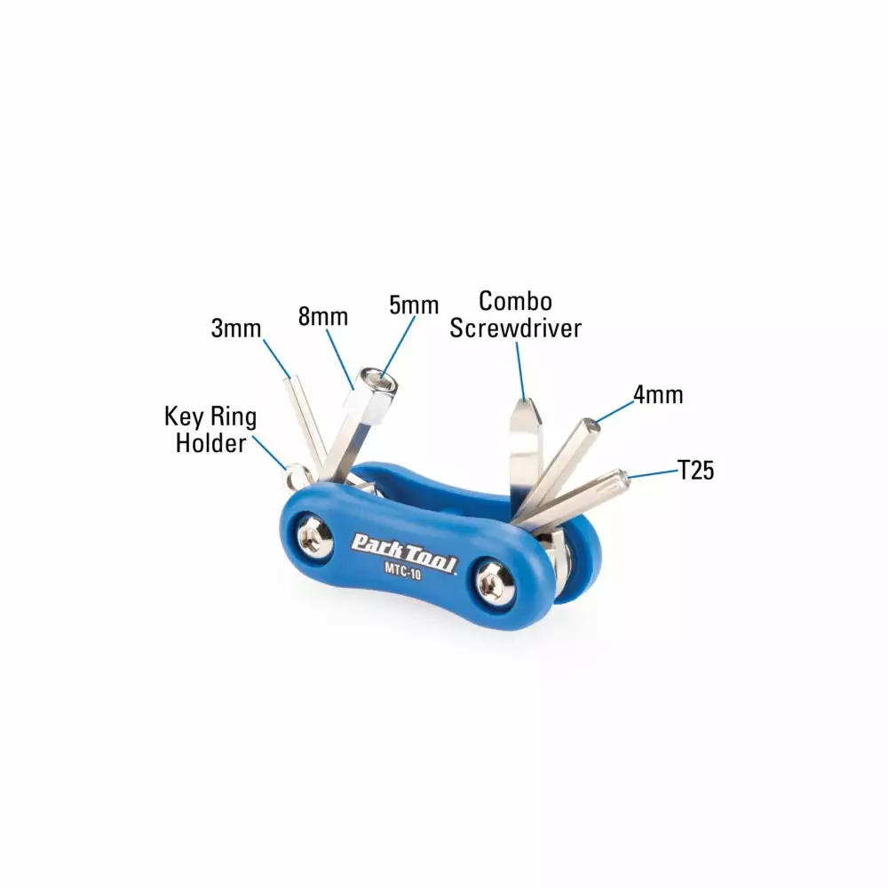 The MTC-10 is a multitool with many options. The hex wrenches consist of 3mm, 4mm, 5mm and 8mm. The multi tool also features a combo cross/straight tip screwdriver and a Torx T25.