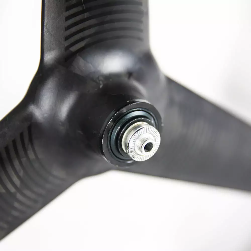 The wheel delivers reliable and smooth performance in varied conditions and can with great advantage be combined with a disc wheel, to complete an incredibly fast time trial machine. The spread tow carbon fibre construction not only looks awesome, but it is also extremely stiff and lightweight, ensuring a very low weight. The design provides minimal drag due to the 3-spoke profile, resulting in a phenomenal performance at high speeds. To prevent interrupting the airflow the valve is positioned behind one of the spokes.