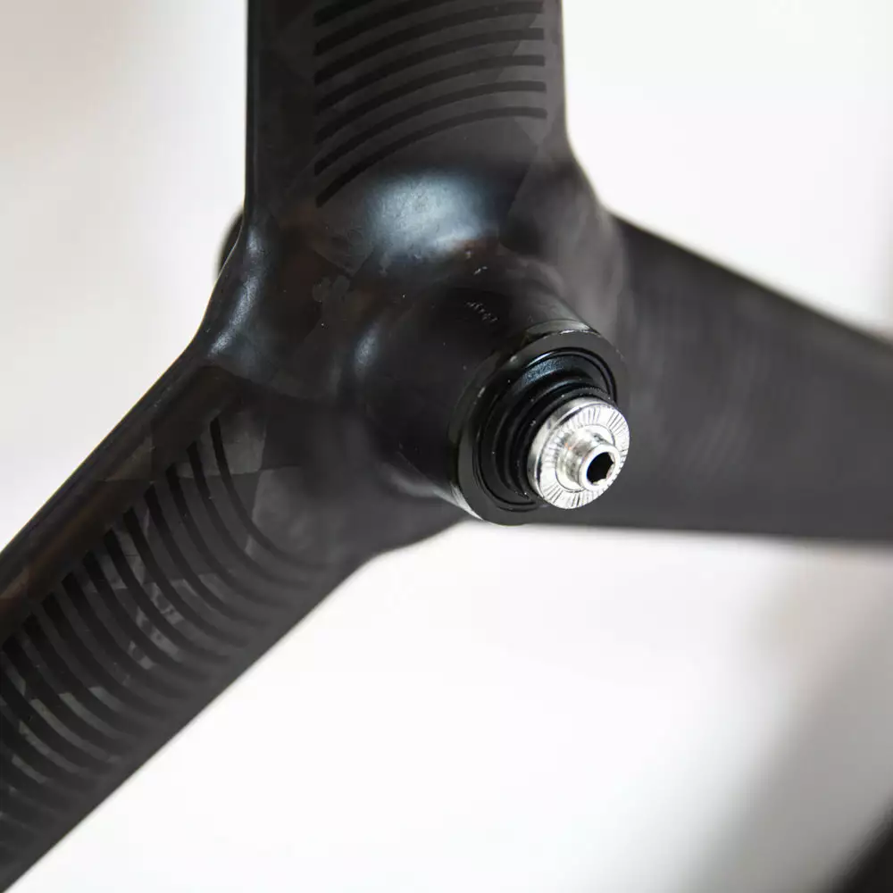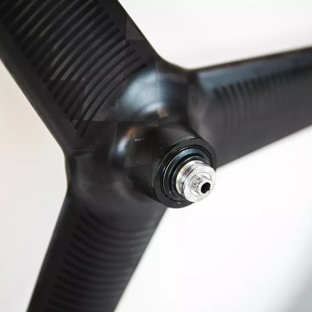 The wheel delivers reliable and smooth performance in varied conditions and can with great advantage be combined with a disc wheel, to complete an incredibly fast time trial machine. The spread tow carbon fibre construction not only looks awesome, but it is also extremely stiff and lightweight, ensuring a very low weight. The design provides minimal drag due to the 3-spoke profile, resulting in a phenomenal performance at high speeds. To prevent interrupting the airflow the valve is positioned behind one of the spokes.
