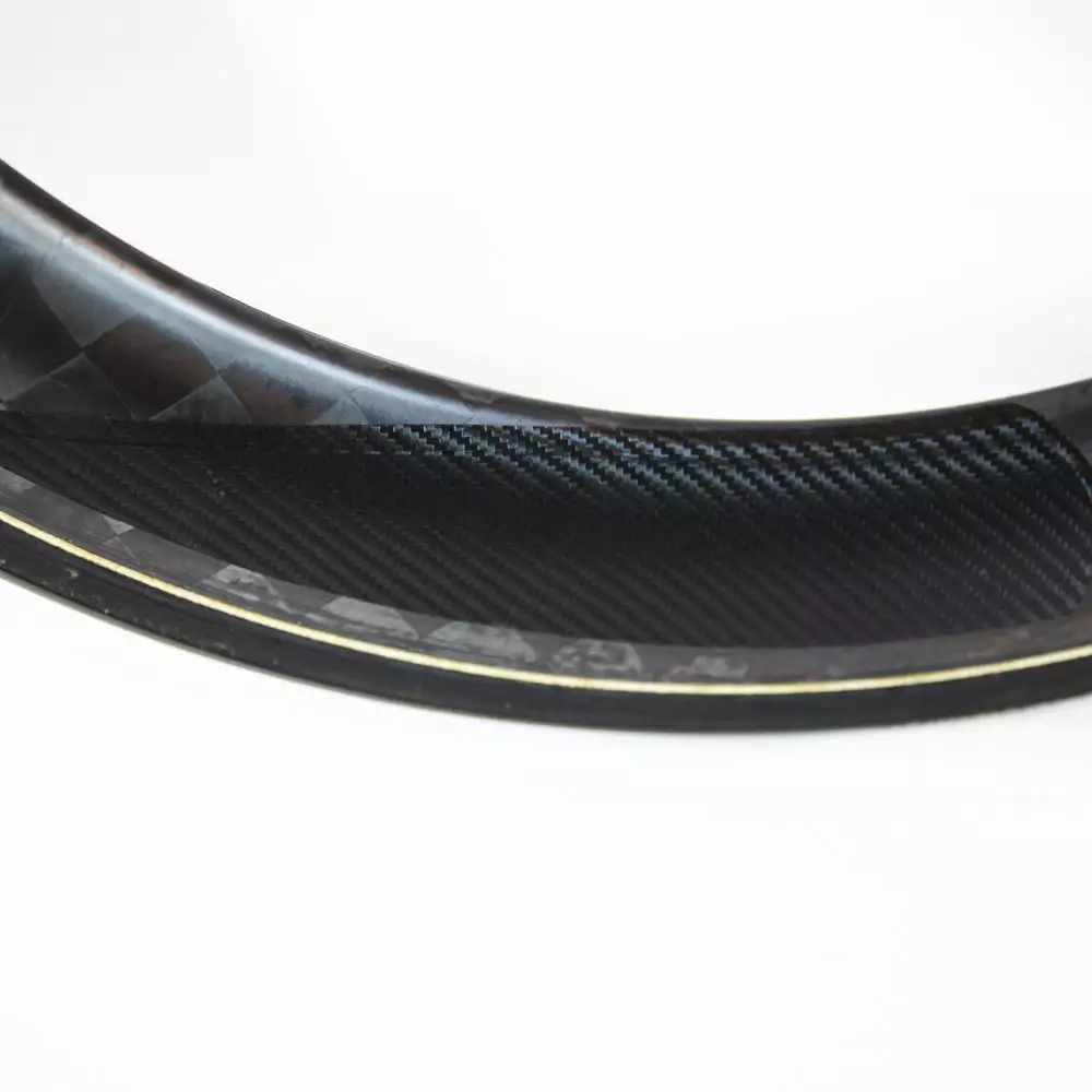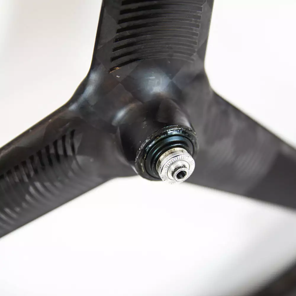 The wheel delivers reliable and smooth performance in varied conditions and can with great advantage be combined with a disc wheel, to complete an incredibly fast time trial machine. The spread tow carbon fibre construction not only looks awesome, but it is also extremely stiff and lightweight, ensuring a very low weight. The design provides minimal drag due to the 3-spoke profile, resulting in a phenomenal performance at high speeds. To prevent interrupting the airflow the valve is positioned behind one of the spokes.