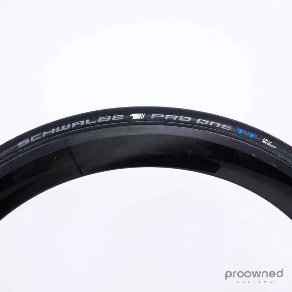 Brand new Schwalbe Pro One TT tubular tire. This is a special team issued version of Schwalbe’s popular One tubular tire, which is not found in the public shops. It is specifically made for use in Time Trials, and have a slick center of the thread for greater straight-line speed while keeping the ruffled surface on the sides for good grip in the corners too.